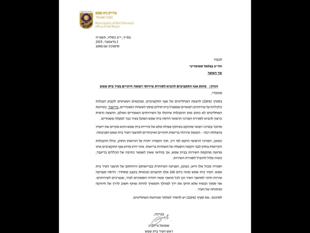 ראש עיריית בית שמש, שמואל גרינברג, פנה לשר האוצר בצלאל סמוטריץ' בדרישה לעצור סעיף בהצעת המחליטים של אגף התקציבים, שלדבריו עלול להביא לסגירת שירותי הרפואה של הדסה בעיר.