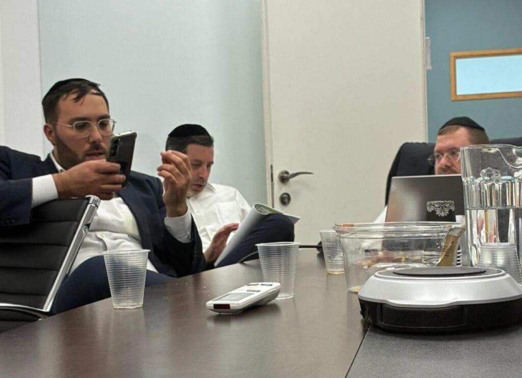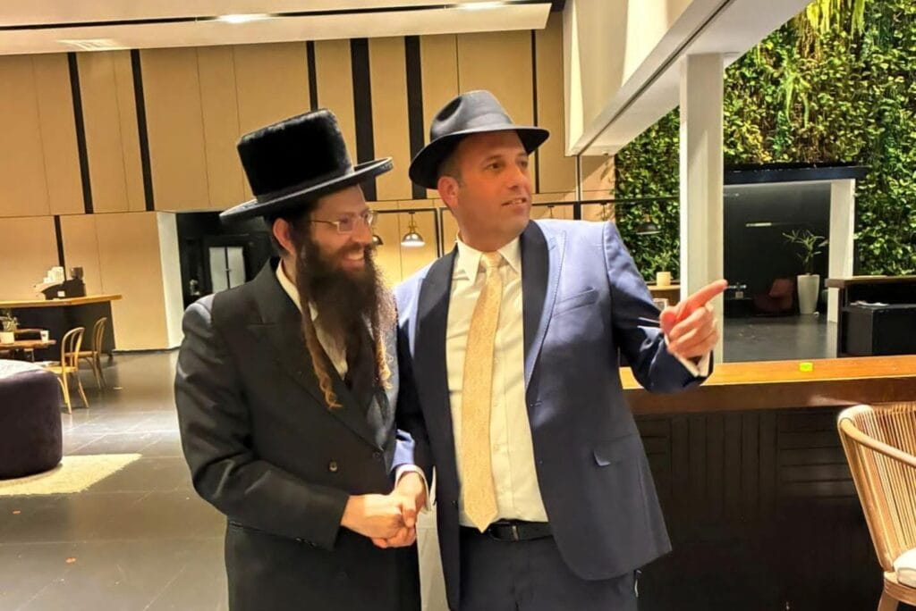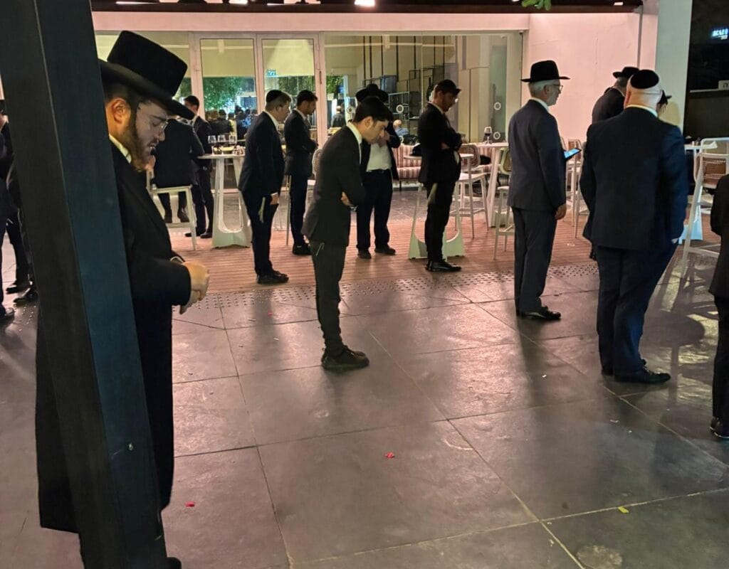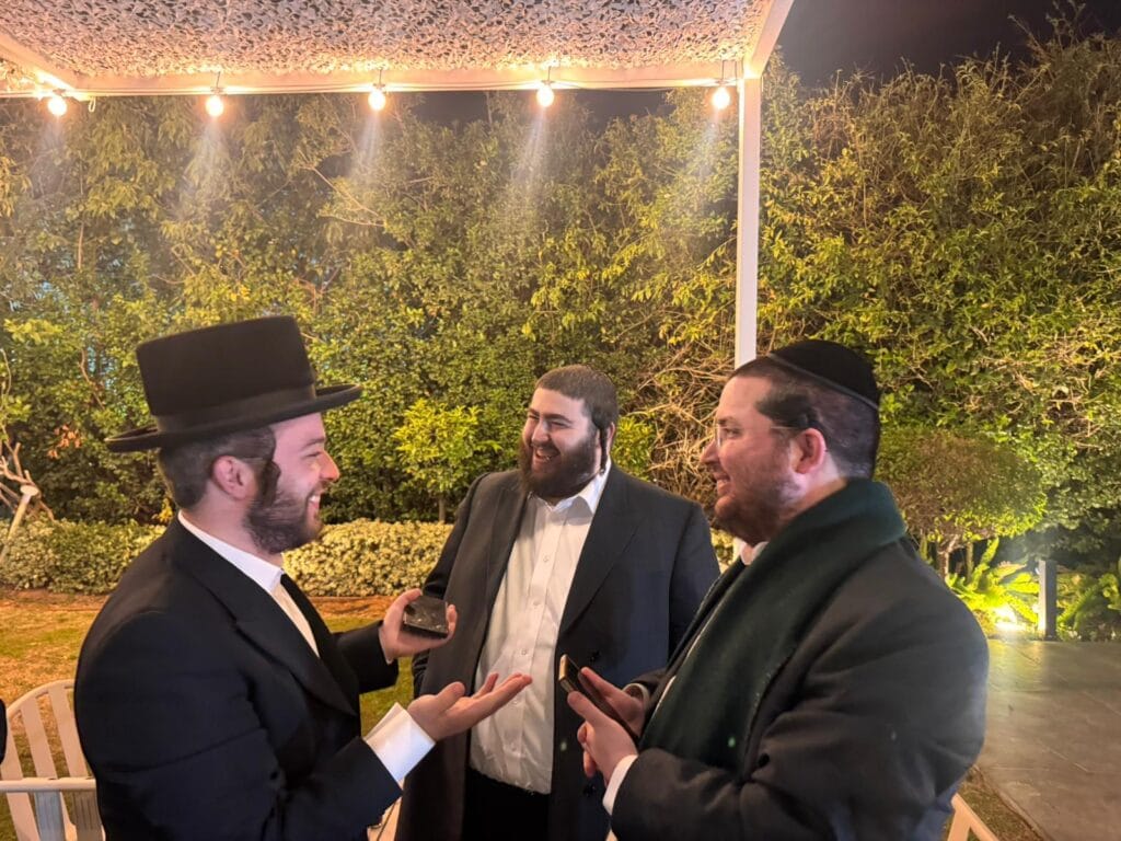 בחתונה, פישל הבחין בחברי הסיעה החסידית בבית שמש – ישעי' ויסמן ואברהם נחמן פרנקל – מרימים לחיים יחד עם צבי פרנקל, אחראי מרכז 'לטובת', בבר המשקאות החסידי. מי שנפקד מהלחיים זה יו"ר הסיעה שמעון גולדברג ששהה בזמן החתונה במטוס בדרך חזרה מז' שבט בלעלוב שבפולין.