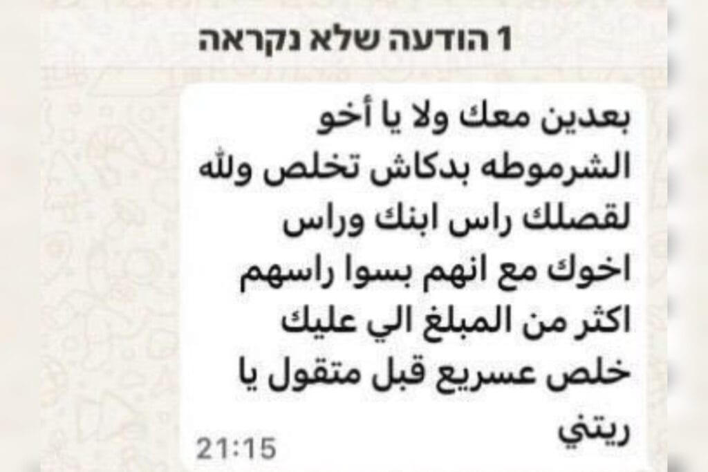 בין הודעות הסחיטה, נשלחה לקורבן הודעת איום בה נכתב "מה יהיה איתך לא רוצה לסיים, נשבע לערוף ראש הבן שלך וראש אחיך למרות שהראש שלהם שווה יותר מהסכום שאתה חייב".