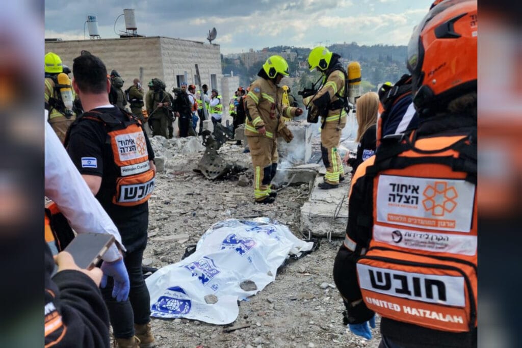 אריה יפה רופא מתנדב באיחוד הצלה, והחובשים משה הורביץ, דוד לף ויחיאל רוזנברג סיפרו: "מדובר בזירת הרס נרחבת במספר מבני מגורים. למרבה הצער אותרו בתוך המבנים תשעה בני אדם ללא רוח חיים. כמו כן הוענק סיוע רפואי למעל 50 נפגעים נוספים במצב קשה, בינוני וקל. צוותי חוסן של איחוד הצלה העניקו סיוע למספר נפגעי חרדה שהיו בסמיכות לזירה".