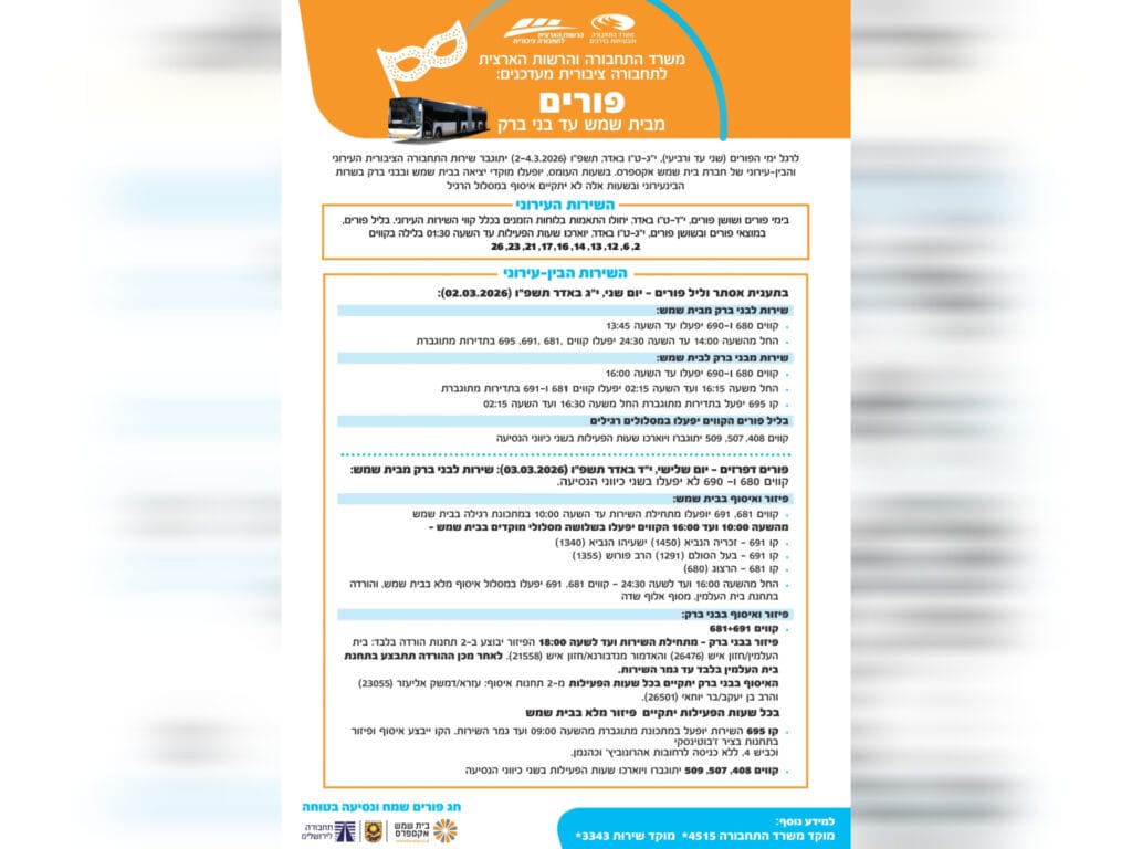 חדשות העיר: משרד התחבורה והרשות הארצית לתחבורה ציבורית מעדכנים על שינויים בהפעלת התחבורה הציבורית לרגל חג הפורים, בין התאריכים 2–4 במרץ 2026 (י"ב–י"ד באדר תשפ"ו). על פי ההודעה שפורסמה, במהלך ימי החג תופעל תחבורה ציבורית מתוגברת בין בית שמש לבני ברק, לצד התאמות בקווי השירות העירוניים.