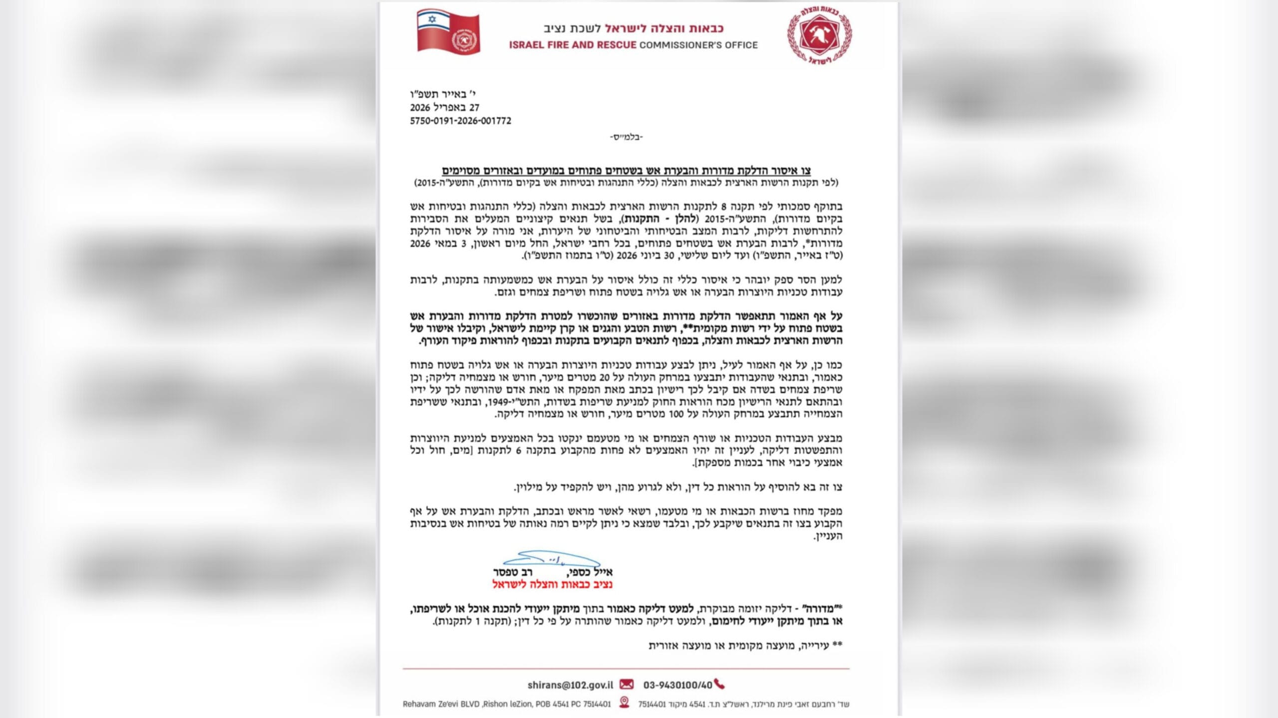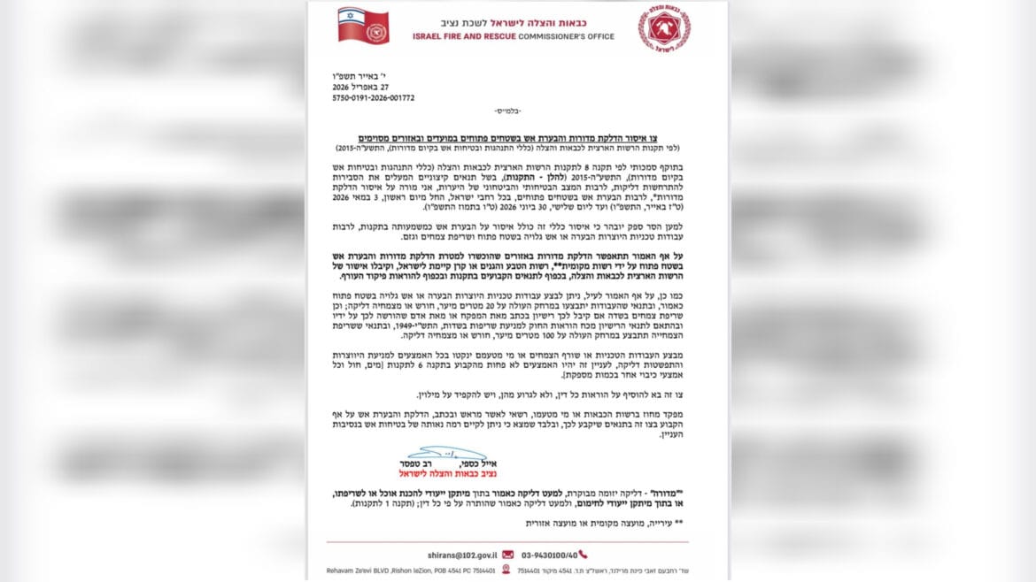 ל"ג בעומר 2026: בשל תנאים קיצוניים המעלים את הסבירות להתפתחות שריפות לרבות המצב הבטיחותי והביטחוני של היערות, חתם נציב כבאות והצלה לישראל, רב-טפסר אייל כספי, על צו איסור הבערת אש והדלקת מדורות בכל רחבי הארץ החל מיום ראשון, 3.5.26, ועד יום שלישי, 30.6.26, בחצות.