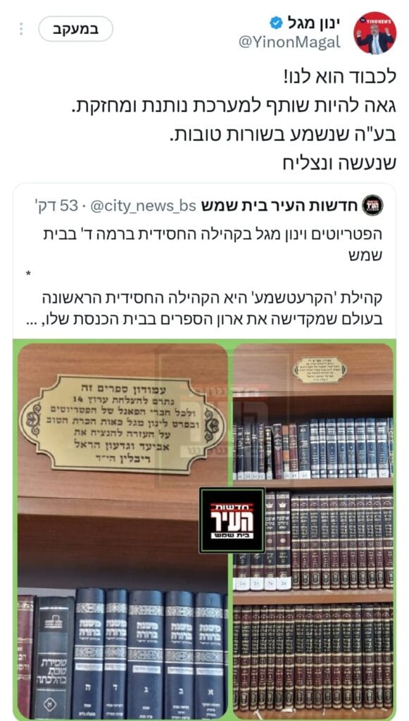 ינון מגל וחברי פאנל 'הפטריוטים' בערוץ 14, זוכים להוקרה מיוחדת בבית הכנסת החסידית ברמה ד' בבית שמש ▪︎ קהילת 'הקרעטשמע' מקדישה את ארון הספרים בבית הכנסת שלו, לתוכנית 'הפטריוטים' בערוץ 14, באותיות מיוחדות שנחרטו על שלט מעוצב ומוזהב ▪︎ כך ינון מגל הגיב לפרסום