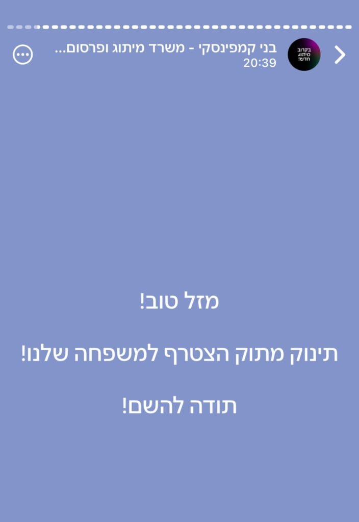 פישל גם התרגש לראות בסטטוס של איש הפרסום בני קמפינסקי על השמחה בלידת התינוק.