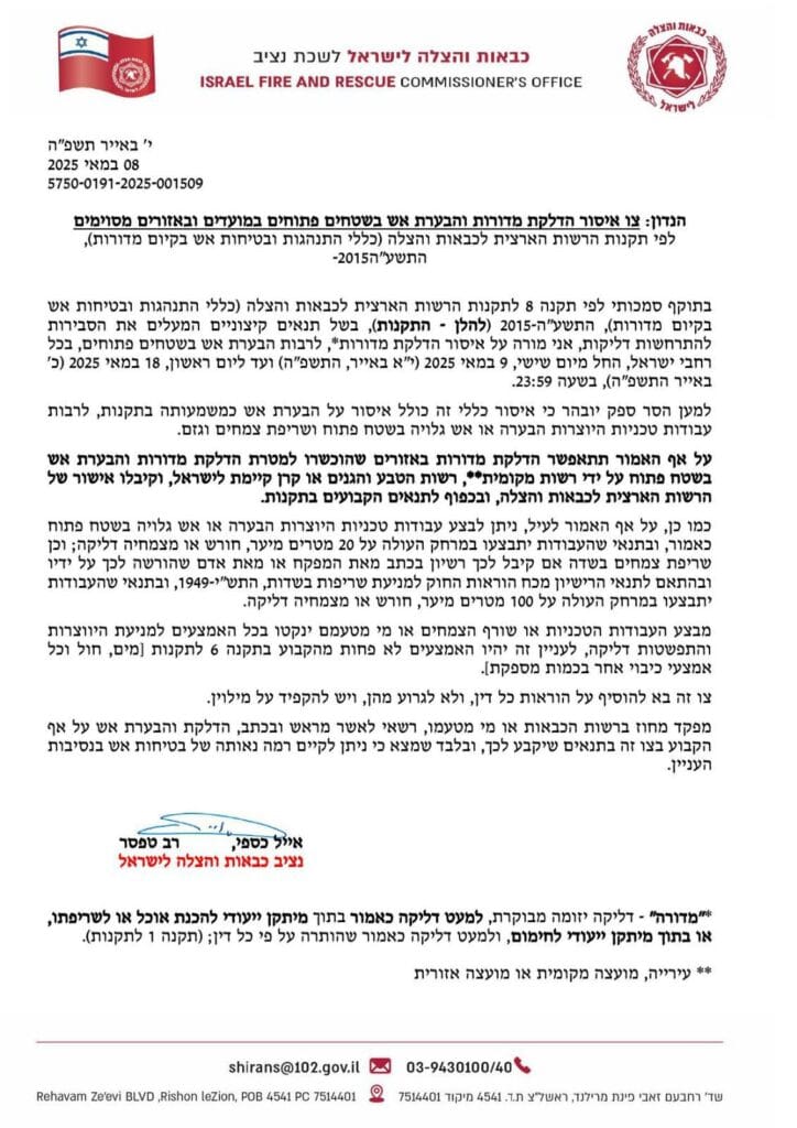 חדשות העיר: בעקבות תנאי מזג האוויר הקיצוניים והחשש המוגבר לשריפות, חתם נציב כבאות והצלה לישראל, רב טפסר אייל כספי, על צו גורף האוסר הבערת אש בכל רחבי הארץ – מה-9 במאי ועד ל-18 במאי בחצות.