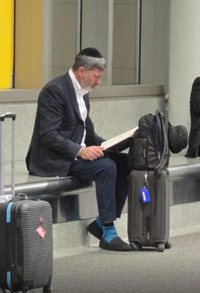 במיקום אחר לחלוטין, פישל ראה את המג"ש המפורסם מבית שמש, ר' אלי סטפנסקי, כשהוא באמצע להכין את שיעור הדף היומי בדרך לחופשה בחו"ל. פישל אהב את הגרביים…