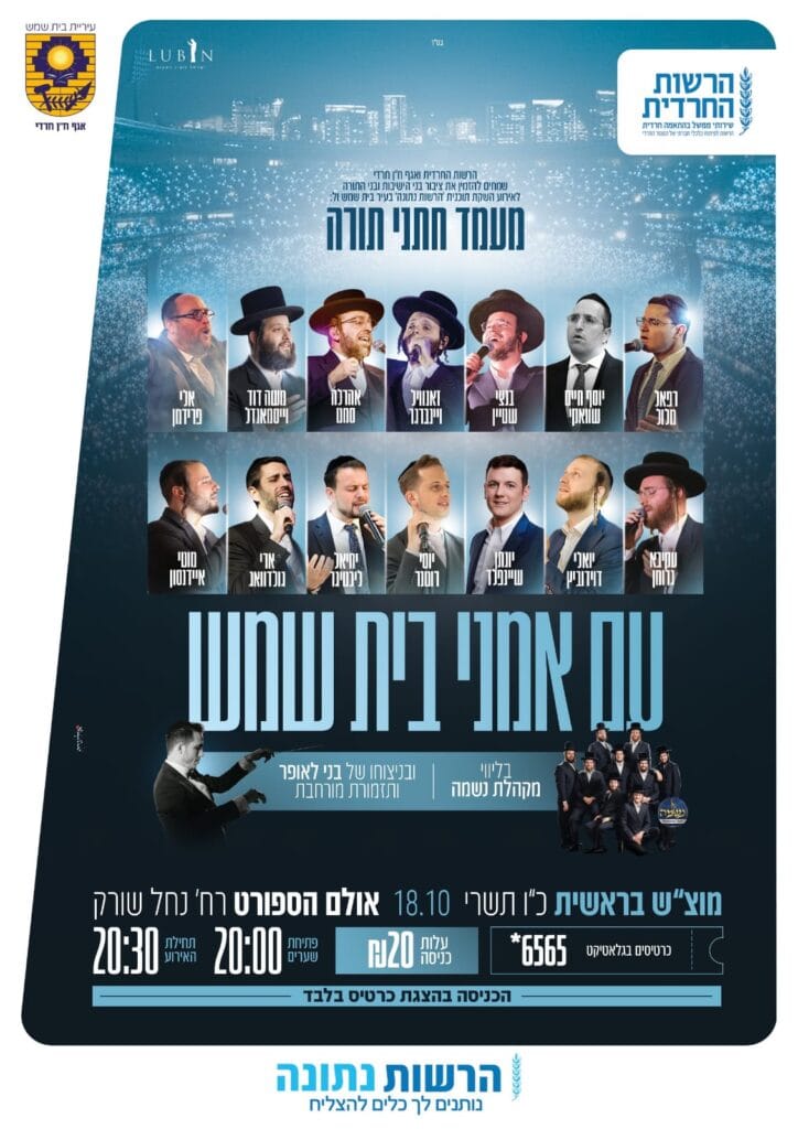 כמו כן, במוצאי שבת בראשית יתקיים מופע ייחודי וראשון מסוגו בעיר, ביוזמת רה"ע גרינברג, לרגל ציון 75 שנה להקמת העיר בית שמש – עם אמנים וזמרים מבית שמש בלבד. לפי התוכנית, כ-15 זמרים יופיעו, בהם אהרל'ה סאמט וזאנוויל ויינברגר. האירוע צפוי להתקיים באולם הספורט ברמה א'.
